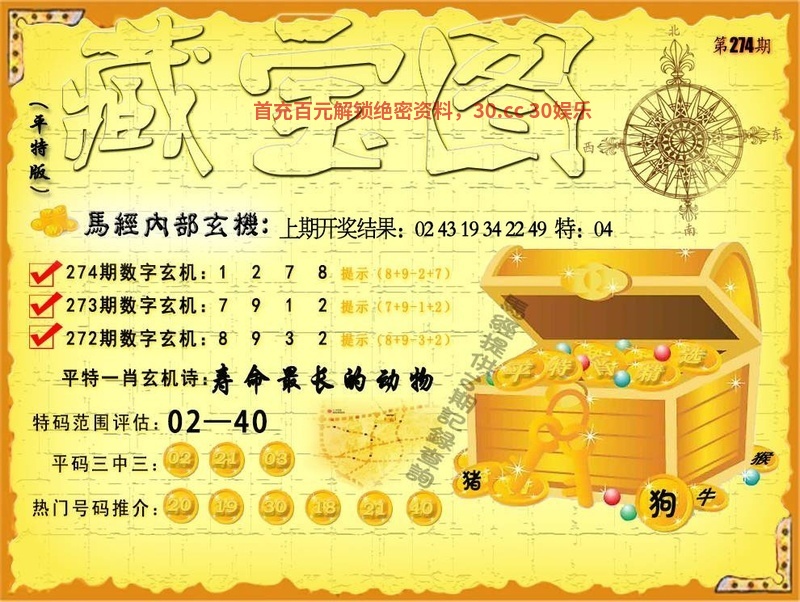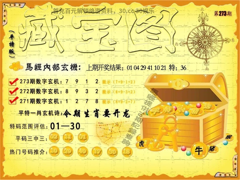 273期:平特藏宝阁玄机 【今期生肖要开龙】 解:今期生肖要开龙,平特虎猪 特码范围评估:01-30 |
