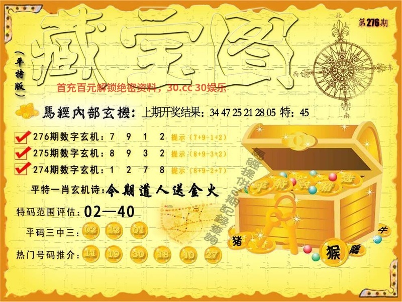 276期:平特藏宝阁玄机 【今期道人送金火】 解:今期道人送金火,平特猪猴 特码范围评估:02-40 |